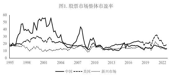 在资本市场开放前,发展中国家的股市估值水平明显低于美国等发达国家。而随着其资本市场逐步开放,发展中国家的股市估值逐渐呈现出向发达国家市场估值水平靠拢的态势。与其他发展中国家相比,中国股市估值则呈现出不同的特征。如图1所示,1995—2022年间,美国股市的整体市盈率相对稳定,维持在约20倍左右。而在1995—2009年之间,中国A股市场的平均市盈率明显高于美国和其他发展中国家,呈现明显的溢价。而在2009年之后,中国A股的估值水平出现较大调整,逐步向其他发展中国家乃至发达市场的估值水平收敛。